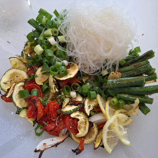 לפרוס דק את הבצל, הזוקיני והעגבנייה ולקלות בתנור, בגריל (לא לשמן את הירקות ולא לתבל). את השעועית הירוקה לחלוט במים רותחים, ולאחר סינון לטגן מעט במחבת, להוסיף את השום וברגע שעולה הניחוח שלו, להסיר מהאש.